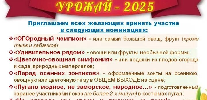 Хотите разбавить серость будней взрывом ярких осенних красок? Приходите всей семьей 19 сентября в ДК «Энтузиаст» на праздник «Урожай -2025»! Хотите увидеть красивейшие зонтики или удивиться необычным пугалам? А может, поболеть за участников овощного творческого многоборья? Или насладиться поделками из урожая? Всё это и многое другое ждет вас!